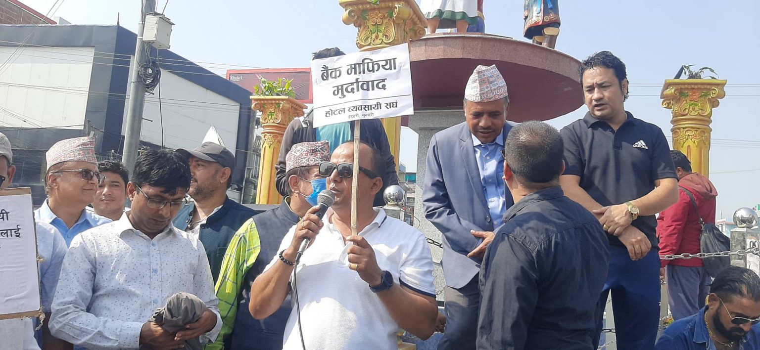 दर्जनौँको संख्यामा भेला भएका व्यवसायीहरूले बैँकको आतंक बन्द गर्न माग गर्दै आन्दोलन गरेका थिए । ‘पुरानो ब्याजदर कायम गर’, ‘बैँक माफिया मुर्दावाद’, ‘व्यवसायी एक हौँ’, जस्ता नारा लगाउँदै आन्दोलन गरेका थिए ।