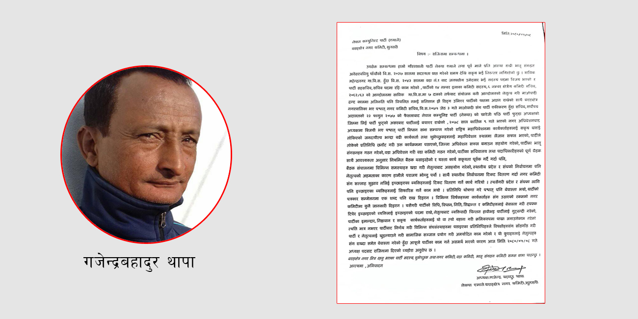 बराहक्षेत्र । गत शुक्रबार नेकपा एमाले बराहक्षेत्र नगर कमिटी अध्यक्ष गजेन्द्रबहादुर थापाले पदबाट राजीनामा गरेको घोषणा गरे । सामाजिक सञ्जाल फेसबुकमार्फत उनको राजीनामापत्र सार्वजनिक भयो । पत्रमा उल्लेख भएअनुसार उनले पार्टीबाट राजीनामा गर्नुको प्रमुख कारण नेतृत्वसँगको असन्तुष्टी भनेका छन् । यद्यपि अन्तर्य भने अलग रहेको छ ।