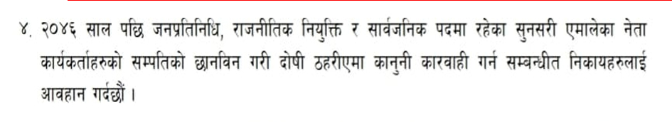 गत कात्तिक २३ गते बसेको जिल्ला कमिटीको विस्तारित बैठकले यस्तो निर्णय गरेको हो । निर्णयमा उल्लेख छ, ‘०४६ सालपछि जनप्रतिनिधि, राजनीतिक नियुक्ति र सार्वजनिक पदमा रहेका सुनसरीका एमाले नेता कार्यकर्ताको सम्पत्ति छानबिन गरी दोषी ठहरिएमा कानुनी कारबाही गर्न सम्बन्धित निकायलाई आह्वान गर्दछौँ ।’